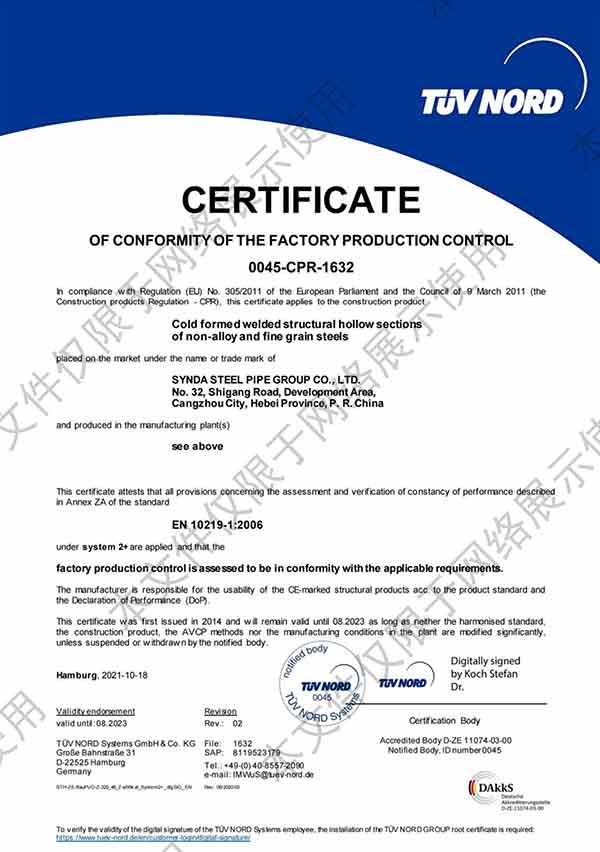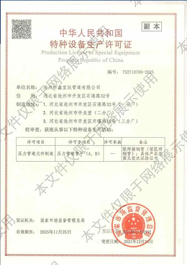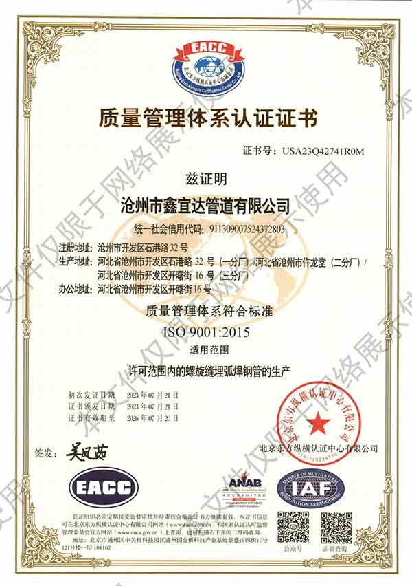 滄州市鑫宜達管道有限公司成立于2003年7月,坐落于滄州經濟開發(fā)區,占地面積40萬平方米,注冊資金1.81億元,是集螺旋鋼管生產、防腐加工以及無縫鋼管、卷板、帶鋼等品類鋼材經營銷售于一體的工貿型企業。公司現有員工400多人,其中,中高級技術職稱的人員達120余名。 滄州市鑫宜達管道有限公司擁有9條螺旋鋼管生產線和3PE防腐生產線,可生產直徑219--3640mm,壁厚5.5--28mm,最高鋼級X100的各種規(guī)格防腐螺旋鋼管...